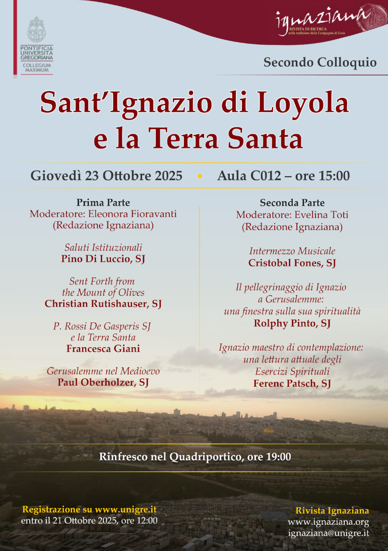 Il tema dell’incontro, “Sant’Ignazio di Loyola e la Terra Santa”, ci porterà a riflettere sul significato spirituale e simbolico del pellegrinaggio di Ignazio a Gerusalemme.